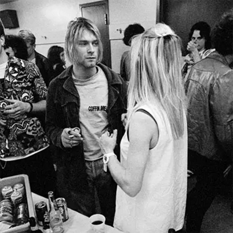“(Kurt)正在和Sonic Youth的Kim Gorden聊天。他们演完了,所有人都在更衣室。我们先拍了个合照,Sonic Youth和Nirvana的所有成员还有几个比赛获胜的人。之后,我开始在人们说话时抓拍。我发现Kurt和Kim说话时简直像个追星族,(虽然)我确定他们之前巡演时见过。那是‘Nevermind’还没发行的时候。”