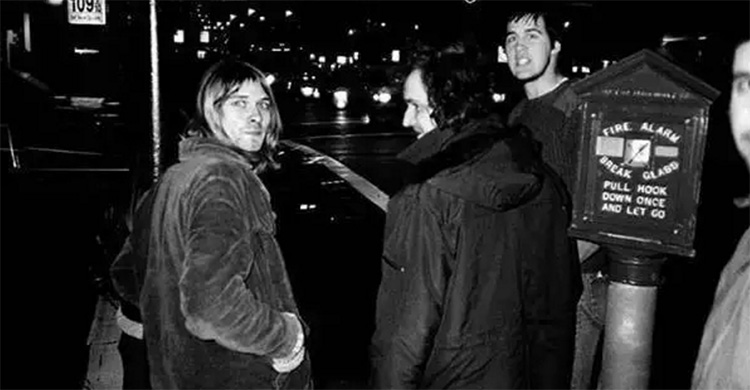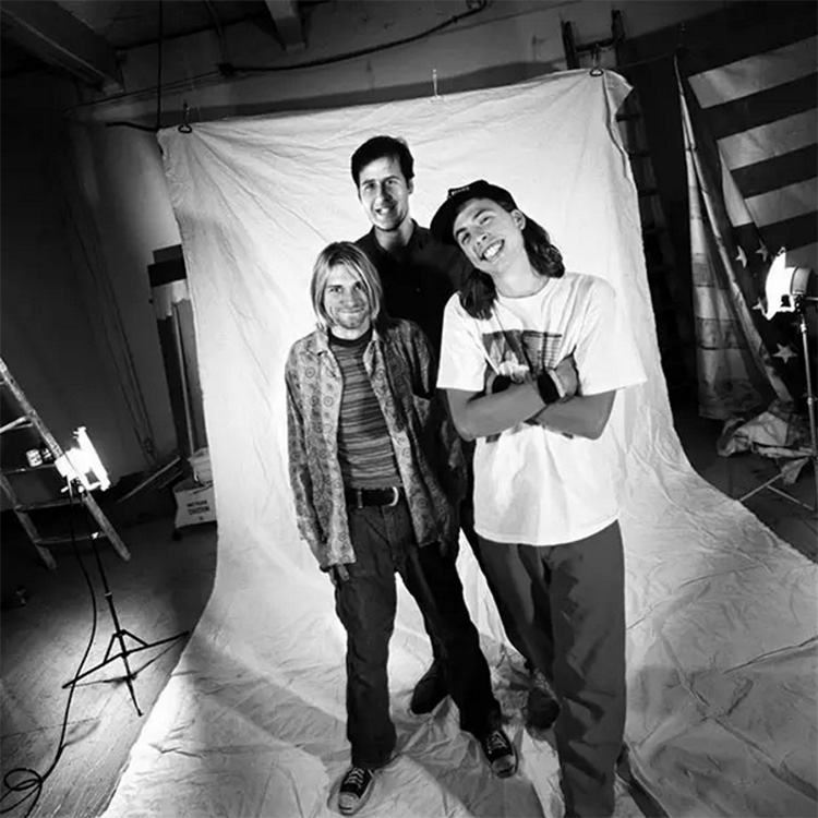 “我喜欢这张照片,因为你能看见后面那些东西,你能看出来成本很低廉。画面里有一个拖把,算是借鉴了‘Smells Like Teen Spirit’ 的MV,里面看门人拿着拖把起舞。拍着拍着乐队开始累了,尤其是Kurt。他们在拍完这组后还要拍其它照片。”