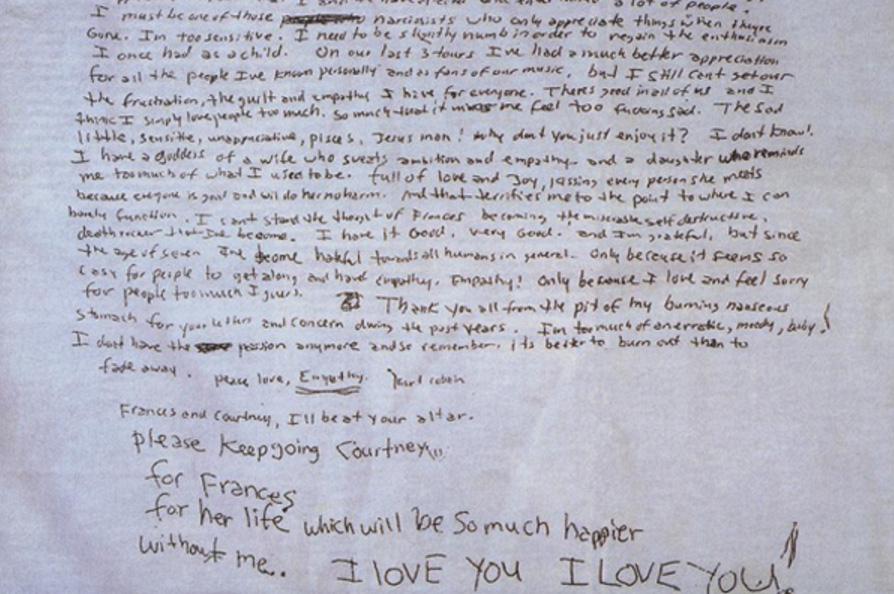 4月5日,Kurt Cobain逝世23周年。每逢这天,总有歌迷习惯性地听Nirvana的歌。虽然平常日子也听,但这天总是有些特别。心情也不会说特别坏,只是有些失落感。为了慰藉这份失落,或者像人们说——纪念Cobain——我打算翻译一下Kurt Cobain的遗书(不敢说翻译得很好,但至少比网上机器翻译的有感情吧):
