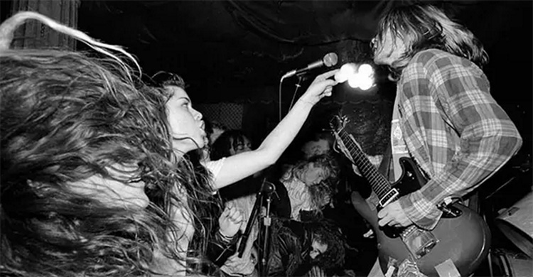 “那一刻感觉就是对了。场子很小,观众也很热情,于是我就正好拍了下来。那天我拍到一些非常棒的照片。左边那位头发遮住脸的女人其实是乐队L7的Donita Sparks。Kurt正前后摇摆,而Sparks的朋友就直指Kurt的脸。当观众融入镜头时,一个照片就可讲述一个故事。有时候我去一些地方拍摄,观众就只是那么站着。我想那晚是L7的那些女孩儿让让照片变得特别。有时你只需要几个观众就可找对感觉。”
