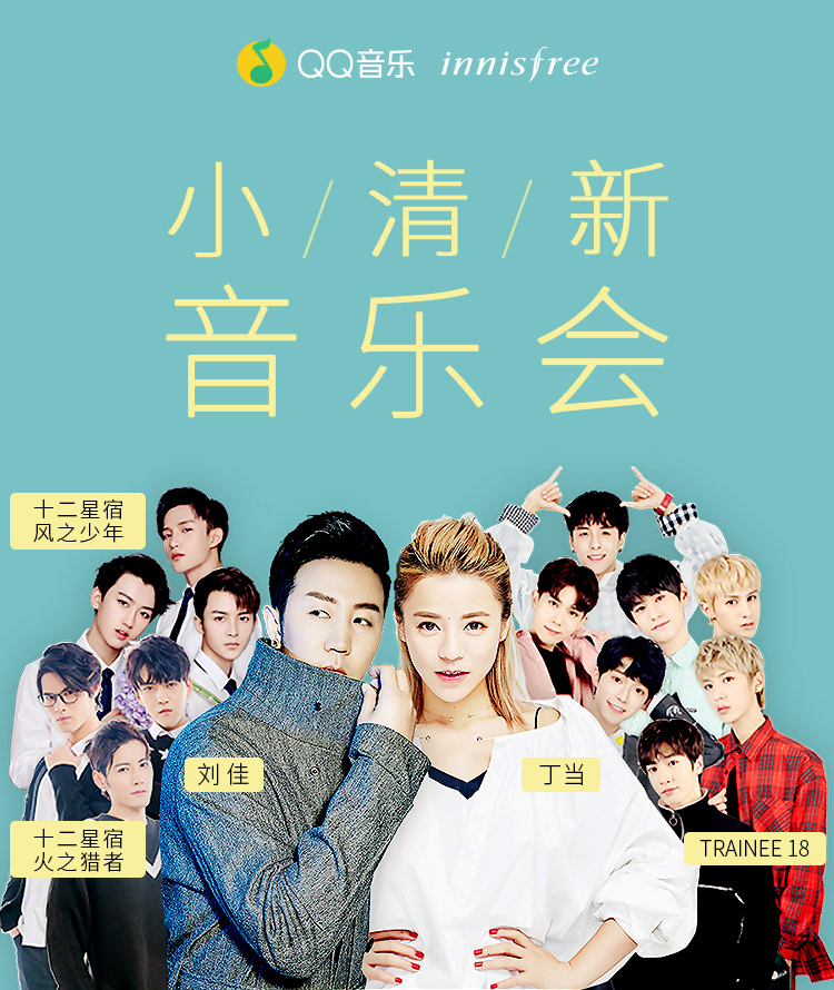 5月27日18:00,QQ音乐将全程直播悦诗风吟玩转小清新节音乐会,届时丁当、刘佳、十二星宿组合、TRAINEE18等明星将助阵现场,跟着爱豆们一起向大自然发出小清新的最强声音!